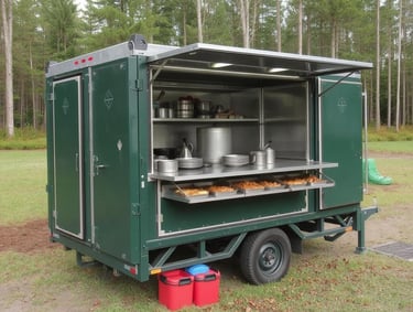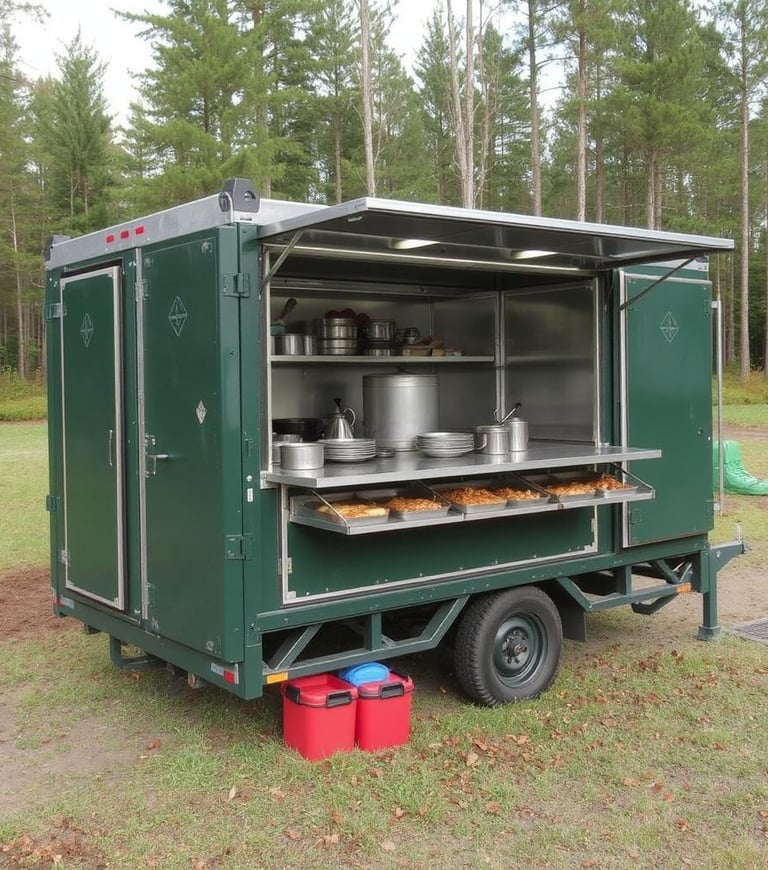 Tiekiame pilnai įrengtas, lengvai transportuojamas maisto gaminimo stoteles, skirtas naudoti lauko sąlygomis arba ten, kur nėra stacionarių virtuvės patalpų. Jos puikiai tinka kariuomenei, gelbėjimo tarnyboms, stovykloms ar renginiams. Galime pasiūlyti ir mobilius dušus, bei tualetus.